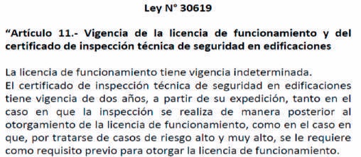 De acuerdo a la anterior normativa DS 058-2014-PCM los Certificados de Inspección Técnica de Seguridad en Edificaciones (ITSE) tenía una vigencia indeterminada. Esto ha sido cambiado luego del incendio en Las Malvinas. En efecto, el 27 de julio de 2017 se publicó la Ley Nº 30619 por la que se establece que los Certificados de ITSE tendrán una vigencia de 2 años. En tal sentido, en adelante los Certificados de ITSE tendrán una vigencia determinada.